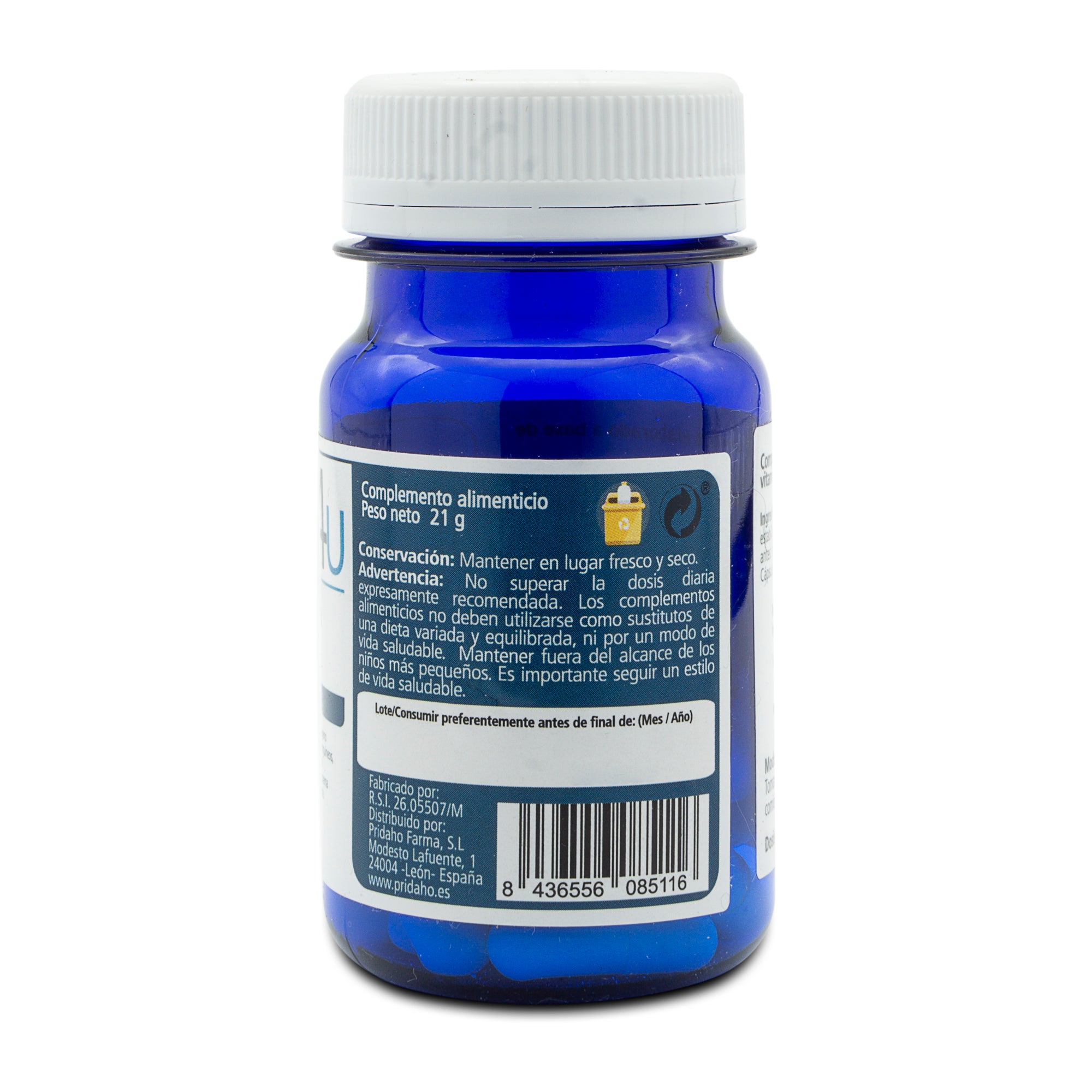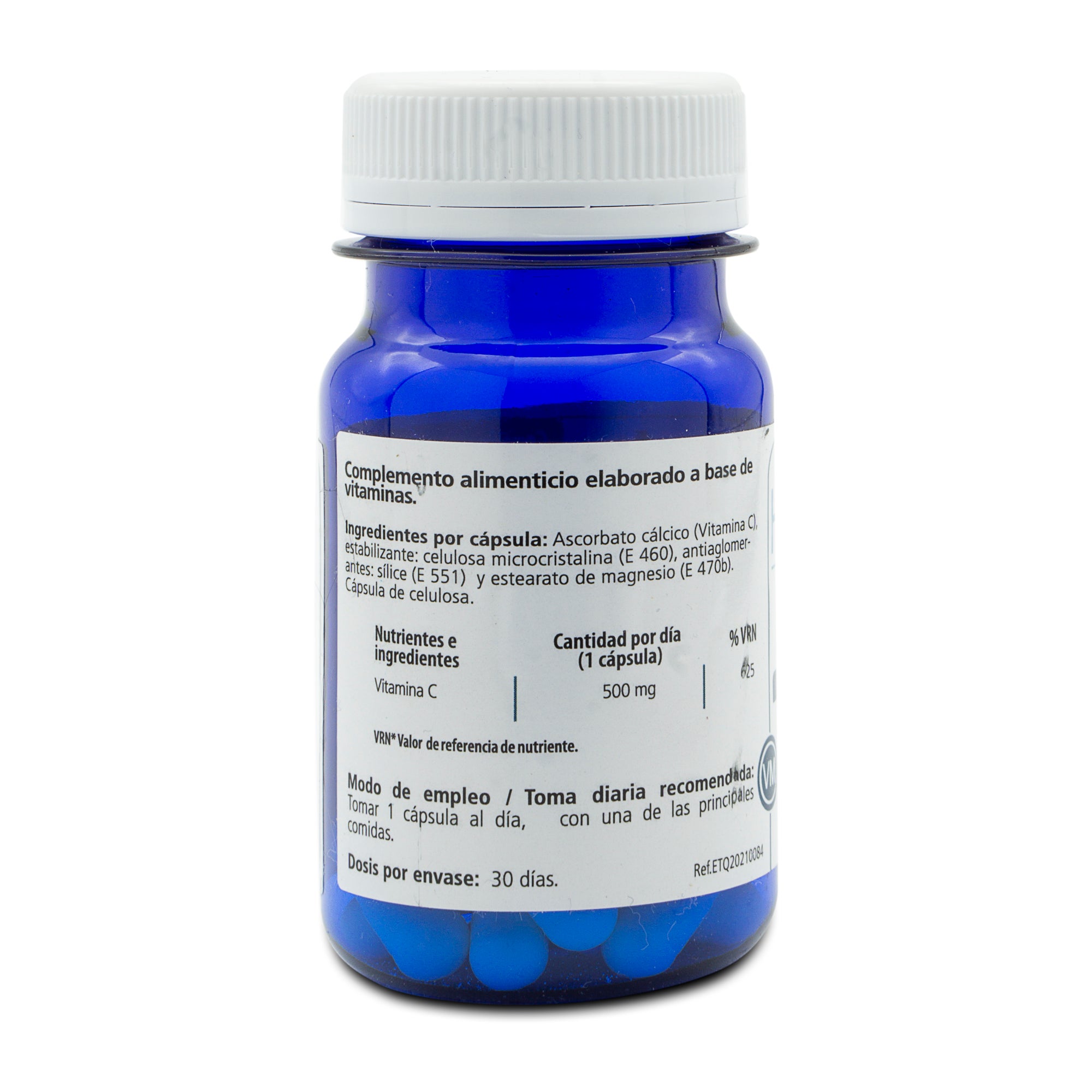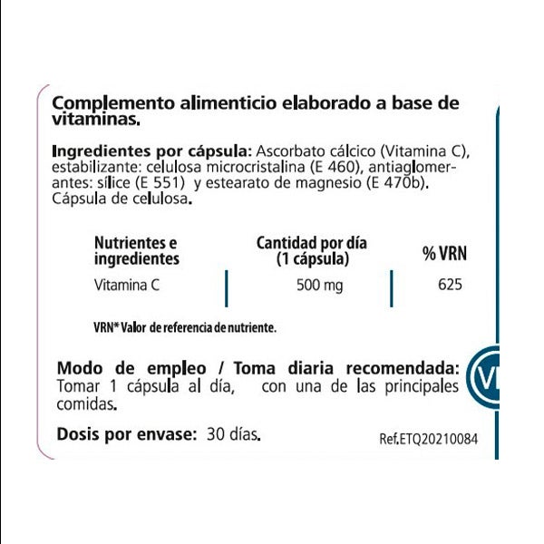 Ingredientes por cápsula: Ascorbato cálcico (Vitamina C), estabilizante: celulosa microcristalina (E 460), antiaglomerantes: sílice (E 551) y estearato de magnesio (E 470b).