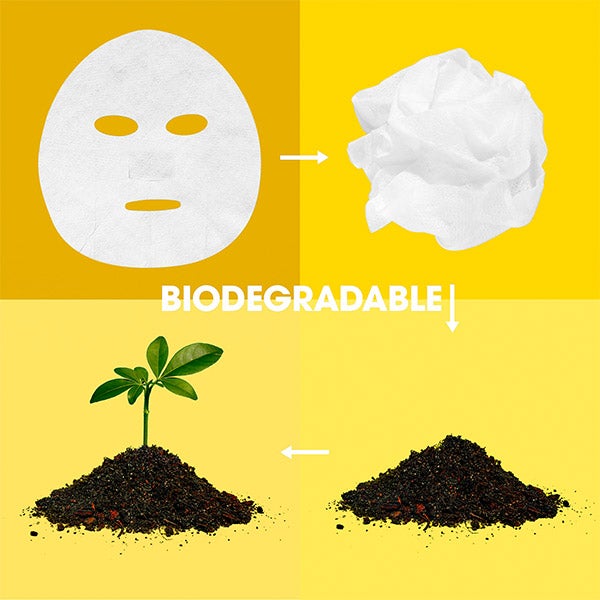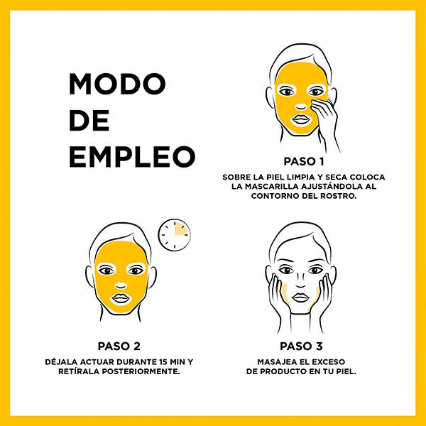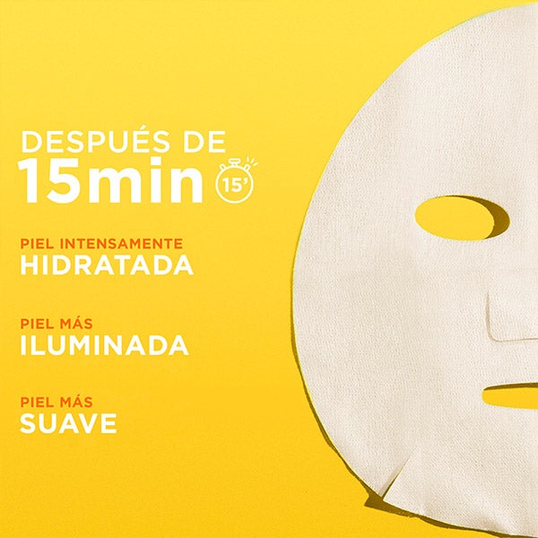 Máscara facial de tecido com Vitamina C e Ácido Hialurônico.