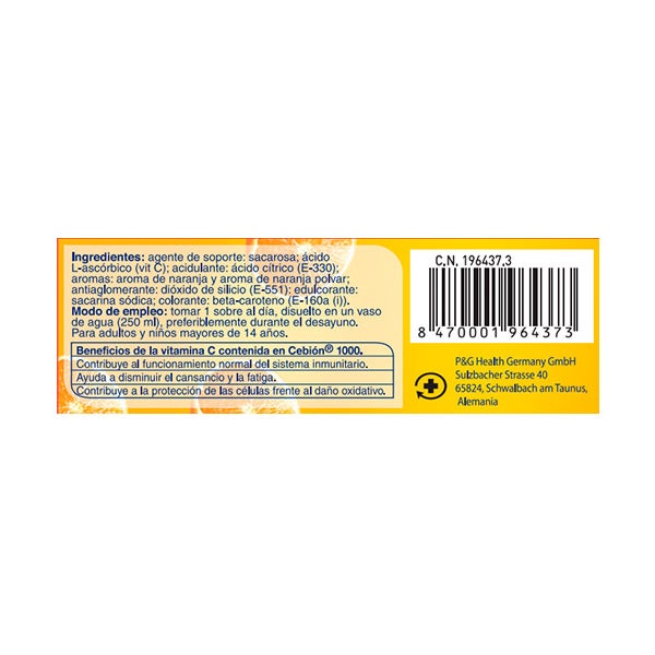 Agente de soporte: sacarosa, ácido L-ascórbico (vitamina C), acidulante: ácido cítrico (E-330), aromas: aroma de naranja y aroma de naranja polvar, antiaglomerante: dióxido de silicio (E-551), edulcorante: sacarina sódica, colorante: beta-caroteno (E-160a (i)).