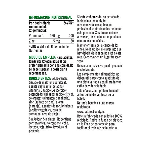 Edulcorantes (jarabe de maltitol, sucralosa), agente gelificante (gelatina), vitamina C (ácido L-ascórbico), potenciador del sabor (ácido cítrico), colorantes (pimentón, zanahoria), zinc (sulfato de zinc), aroma (naranja), agentes de recubrimiento (aceites vegetales, cera de carnauba, cera de abeja).