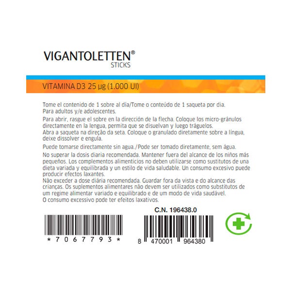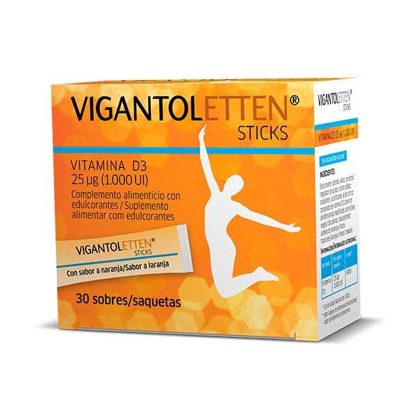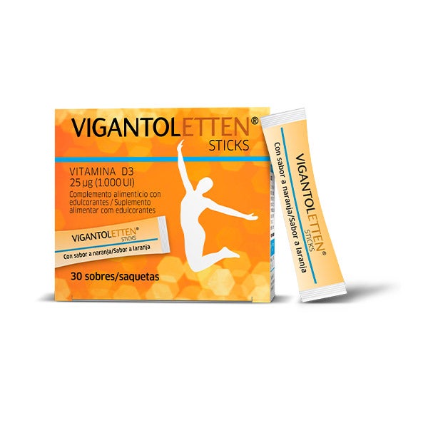 Vigantoletten Vitamina D3 vem em um formato de stick que fornece 25 mcg (1000 UI) de vitamina D3.