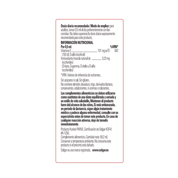 Solgar Vitamina E Líquida de Fonte natural, apresenta-se em uma formulação líquida para favorecer a absorção deste nutriente lipossolúvel e contém a dose diária recomendada de vitamina E em apenas 5 gotas por dia.