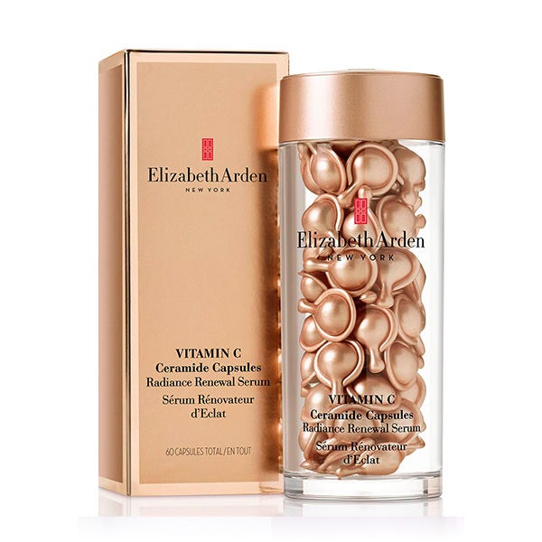 Cápsulas de Vitamina C Ceramida Soro de Renovação de Radiância de Elizabeth Arden, é um soro encapsulado que previne a perda de umidade.