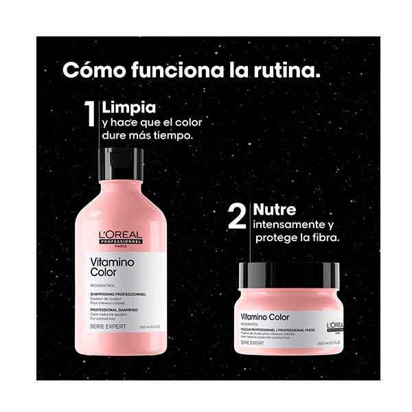 Máscara Vitamino Color (250ml): Ajuda a manter a cor do cabelo por muito tempo. Protege a cor por até 8 semanas. A fórmula profissional da máscara Vitamino Color enriquecida com Resveratrol protege a cor por até 8 semanas. Remove suavemente as impurezas, deixando o cabelo instantaneamente sedoso, brilhante e protegido da raiz às pontas.