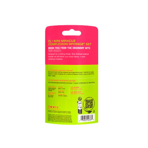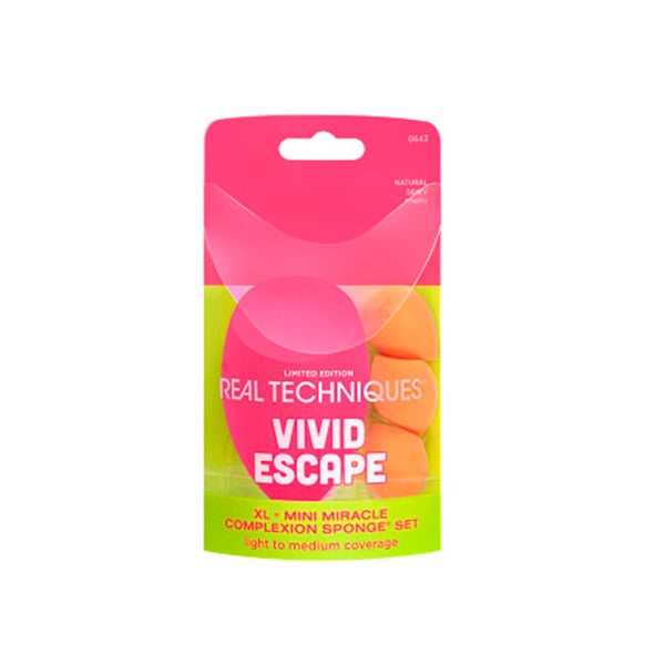 Rompa com o comum com o conjunto de esponjas Vivid Escape XL + Mini Miracle Complexion da Real Techniques. Projetado para um acabamento impactante, este conjunto de esponjas de edição limitada deixará sua base hidratada e suas olheiras mais brilhantes para uma base natural e ousada. Este conjunto inclui nossa esponja de maquiagem mais vendida em dois tamanhos diferentes. Seus poros microfinos ajudam a criar uma base uniforme com uma cobertura de leve a média. As esponjas para esfumar maquiagem são recomendadas úmidas com base líquida e em creme, corretivo, tintes para a pele, hidratante com cor, creme BB, iluminadores, blush, bronzer, contorno e iluminador.