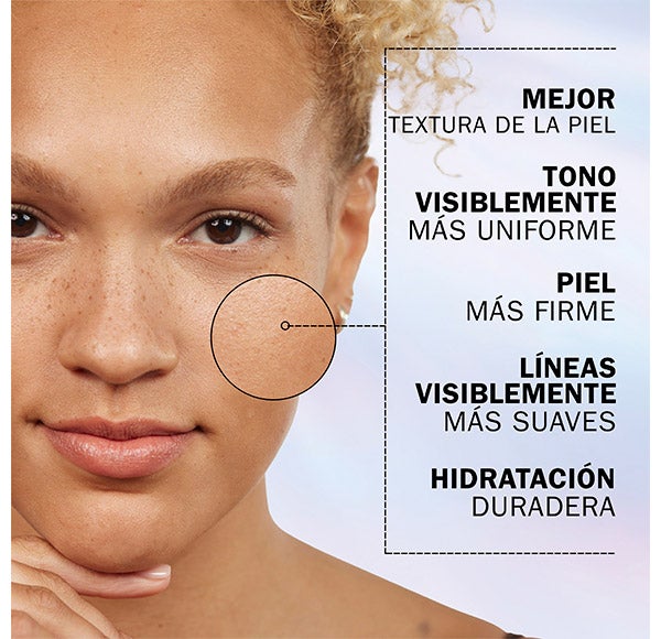 Melhor textura da pele, Tom de pele mais uniforme, Pele mais firme, Linhas visivelmente mais suaves, e Hidratação