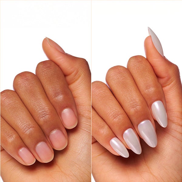 Prepare suas unhas limpando-as com o pano de limpeza de unhas. Escolha o tamanho de unhas adequado e lixe-as suavemente para que se ajustem melhor. Aplique um pequeno ponto de cola tanto na unha natural quanto na postiça e espalhe uniformemente. Espere 5 segundos antes de pressionar. Comece com o dedo mindinho e deixe o polegar para o final. Mantenha pressionado por 30 segundos. Use a espátula de manicure para limpar o excesso de cola imediatamente. Dica: menos cola significa menos sujeira e um resultado mais limpo.