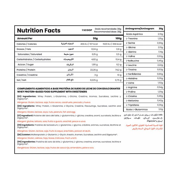 Whey Protein, L-Glutamina, L-Glicina, Creatina, Aromas, Sucralosa, Lecitina y Digezyme®.