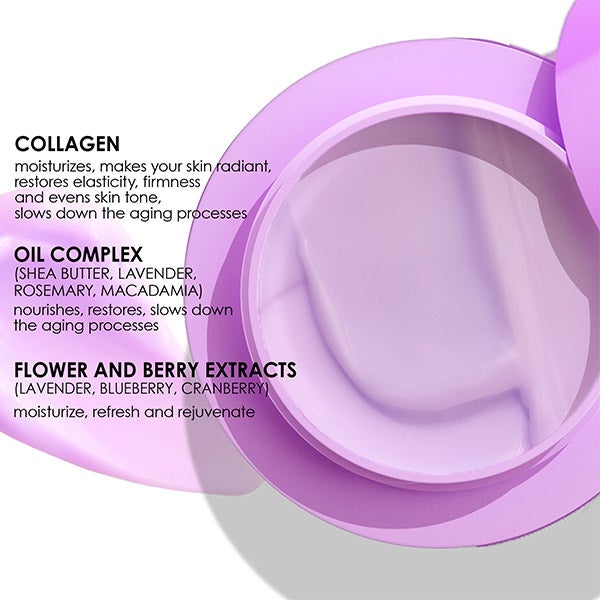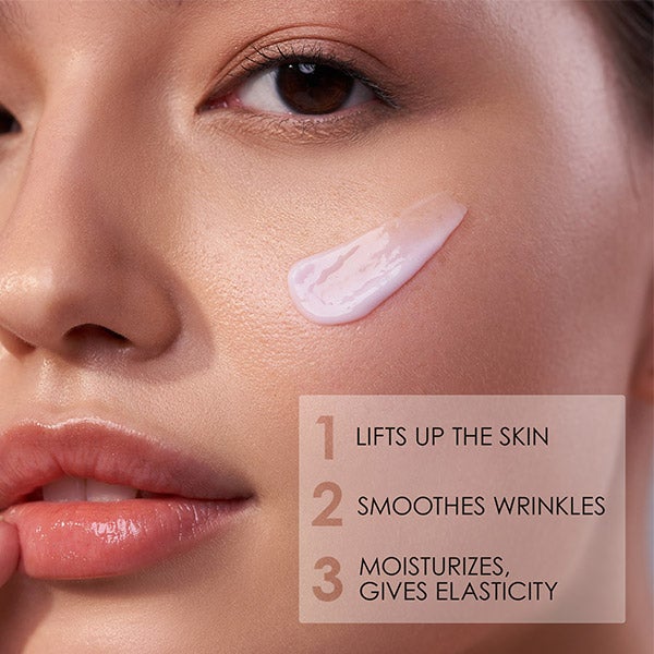Ingredientes Ativos: Colágeno eleva, combate rugas; complexo de óleos nutre e suaviza.