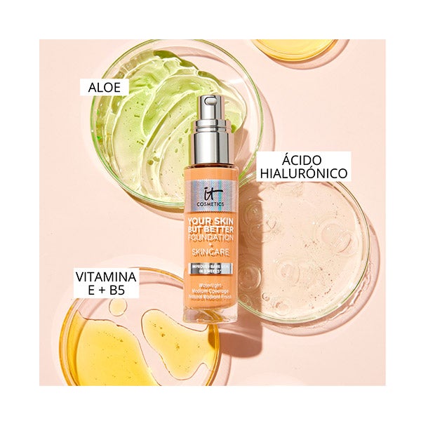 O QUE É? IT COSMETICS Your Skin But Better Foundation + Skincare é uma base de maquiagem com tratamento de textura leve e cobertura média modulável com acabamento radiante natural.