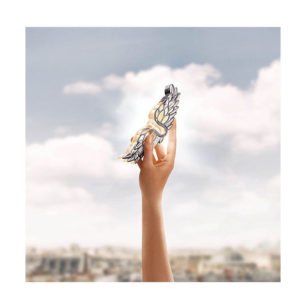 Desafiando as convenções, o frasco disruptivo em forma de asa é um símbolo de liberdade.