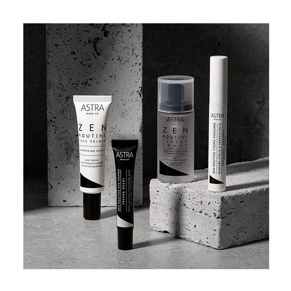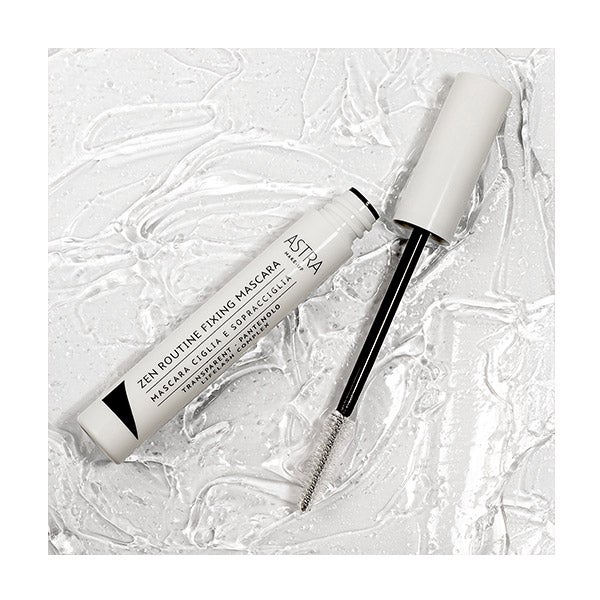 Zen Routine Fixing Mascara é uma máscara para cílios e sobrancelhas que combina duas funções: nas sobrancelhas, fixa e mantém no lugar por muito tempo; nos cílios, realça o olhar de forma natural, cuidando deles. Contém pantenol, com uma ação altamente nutritiva e hidratante, e o exclusivo Life Lash Complex, um complexo à base de extrato de trevo vermelho que ajuda a aumentar a vitalidade e o tamanho dos folículos. O resultado: cílios brilhantes, saudáveis e perfeitamente estilizados. Um gel cristalino infundido com sublimes propriedades nutritivas e fortalecedoras. Zen Routine é a coleção da Astra Make-Up dedicada ao mundo do primer: fórmulas de alto desempenho capazes de aumentar a duração da maquiagem através de uma sensorialidade relaxante e satisfatória, organizadas em passos rituais em um jardim zen ideal.
