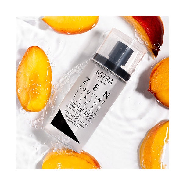 Zen Routine Fixing Spray é um spray facial capaz de prolongar a fixação da maquiagem, proporcionando uma sensação de frescor extraordinário. Uma nuvem muito leve que difunde um intenso aroma de pêssego, inspirado nos vapores benéficos do hammam. A fórmula do Spray Fixador, à base de água e sem álcool, está enriquecida com extrato de calêndula e pêssego, com propriedades calmantes e revitalizantes, assim como com água de flor de laranjeira. Um único produto para 3 funções: primer, tônico e fixador facial. Zen Routine é a coleção da Astra Make-Up dedicada ao mundo do primer: fórmulas de alto desempenho capazes de aumentar a duração da maquiagem através de uma sensorialidade relaxante e satisfatória, organizadas em passos rituais em um jardim zen ideal. Produto com certificação de qualidade vegana